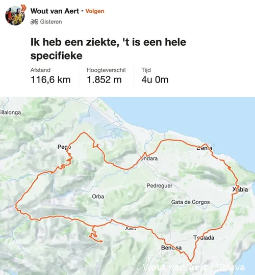 Den belgiske rytter delte for nylig en træningstur på 116 kilometer, der tog præcis fire timer, men det var billedteksten, der virkelig fangede opmærksomheden.