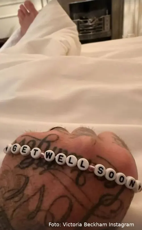 Et af de delte billeder viser Beckhams knyttede hånd, hvor han holder et armbånd med teksten "Bliv snart rask".