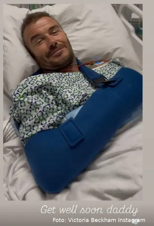 Victoria Beckham har delt billeder af sin mand fra en hospitalsstue i USA, hvor han ses med højre arm i en slynge.
