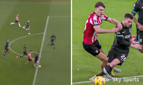Dommer Samuel Barrott pegede på pletten, da Liverpools Andrew Robertson tacklede Southamptons unge stjerneskud Tyler Dibling lige på grænsen til straffesparksfeltet.