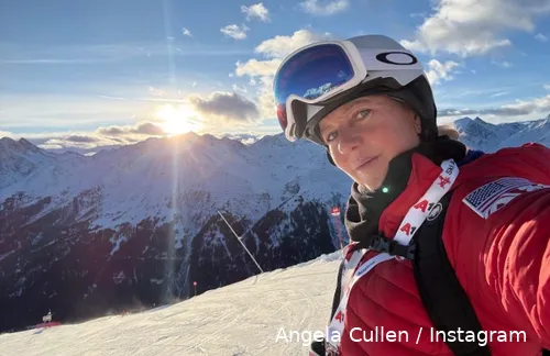 På billedet står hun på en skibakke iført en jakke i Ferraris karakteristiske røde farver.