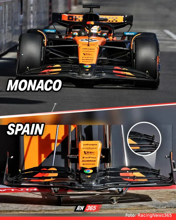 På McLarens bil er forskellen tydelig, når man sammenligner frontvingen fra Monaco Grand Prix med den nye version, der benyttes i Barcelona.