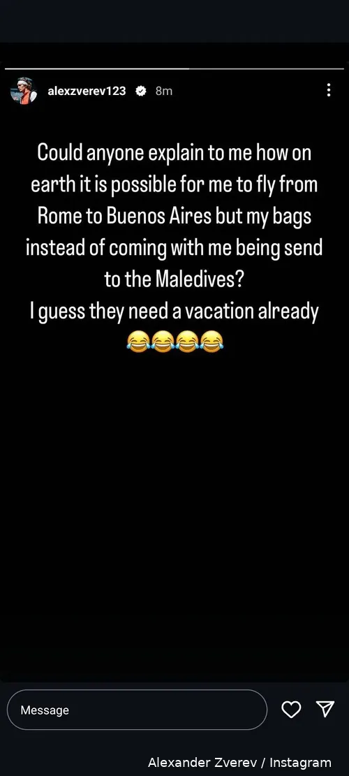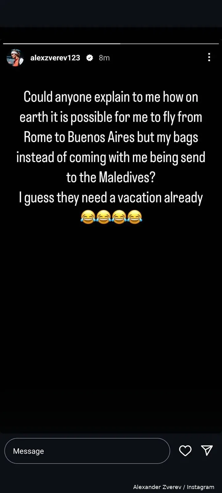 I et humoristisk opslag på sociale medier afslørede Zverev, at hans kufferter i stedet var blevet sendt til Maldiverne.